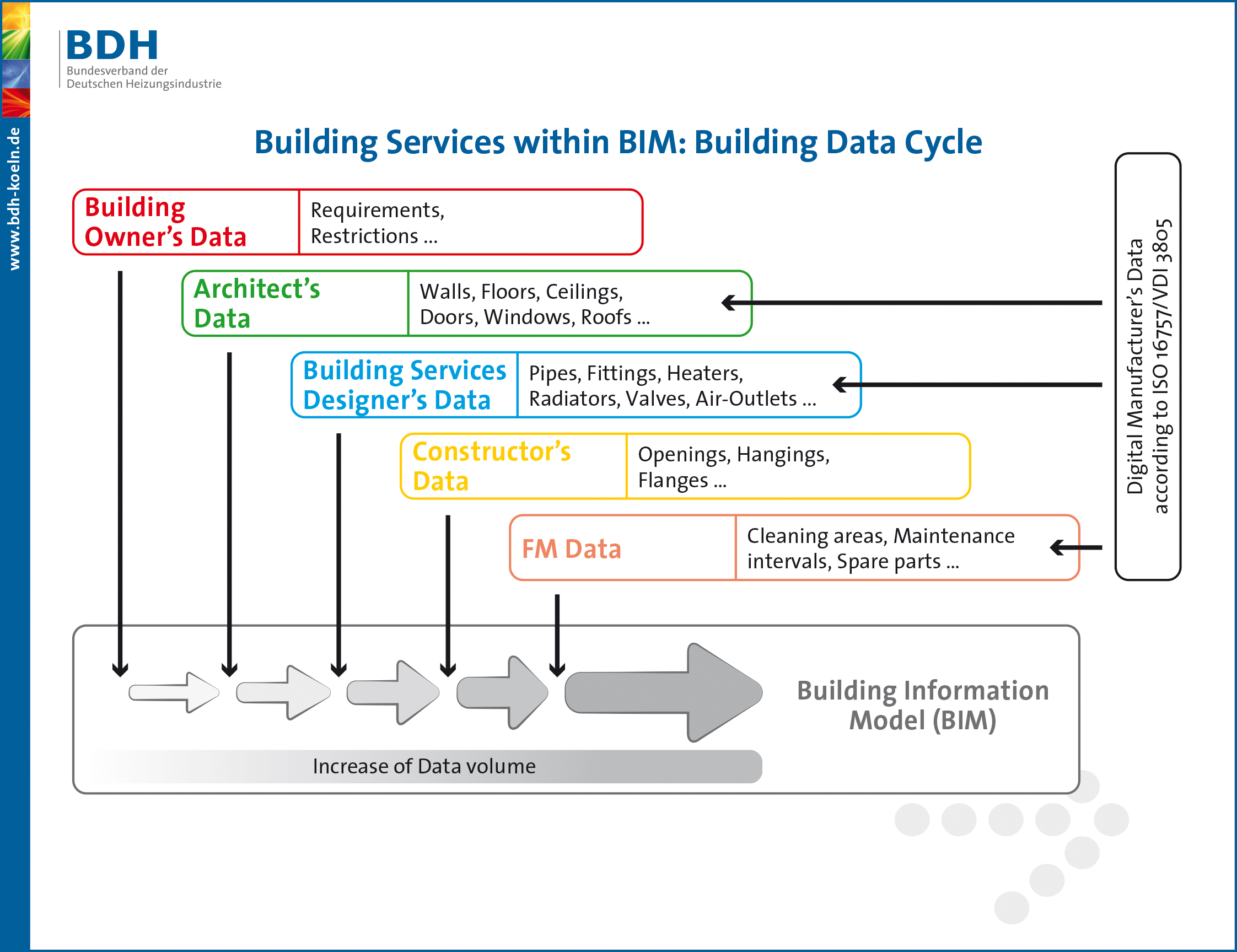 L'objectif de la VDI 3805 est de normaliser la collecte des données requises, afin de les tâches les plus variées grâce à l’accès à une seule base de données de produits. Pour que les utilisateurs de logiciels n’ayant pas leur propre interface VDI 3805 puissent rechercher et importer les données produit souhaitées, la BDH (l'association fédérale allemande des industries en technique du bâtiment, de l’énergie et de l’environnement) propose cette application web, où les données à jour des fabricants sont centralisées. L'utilisateur exporte ensuite de cette base de données les informations produit requises pour l'application concernée (données de CAO et / ou techniques dans le format de données requis). Toutes les personnes impliquées dans le processus de planification peuvent ainsi facilement compiler les données dont ils ont besoin, ce qui limite les pertes de temps et les erreurs.